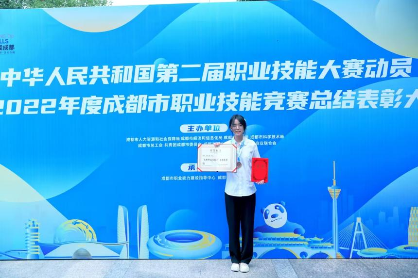 近日,成都市人力资源和社会保障局在成都市广播电视台召开“中华人民共和国第二届职业技能大赛动员暨2022年度职业技能竞赛总结表彰大会”。我校交通运输与信息工程系学生汪雨薇荣获成都市第八届青年技能竞赛平面设计技术赛项第三名,被成都市人力资源和社会保障局授予“成都市技术能手”称号,并获现金奖励一万元。